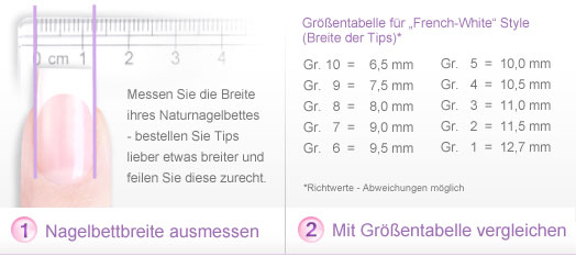 Suchen Sie die passende Tip Größe aus. Es gibt 10 unterschiedliche Größen, wobei die Größe 1 die Größte ist. Halten Sie den Tip an den Naturnagel. Er muss bündig an den Nagelrändern sitzen. Sollte es keine passende Größe geben, wählen Sie eine Nummer größer und feilen Sie ihn in Form. Drehen Sie dann den Tip mit der Auflagefläche nach oben und geben einen Tropfen Tipkleber auf die Klebefläche. Durch Drehen des Tips lassen Sie den Tipkleber über die Klebefläche laufen. Der Tip wird nun auf den Naturnagel gesetzt und einige Male nach vorne und hinten geschoben, damit sich der Kleber verteilen kann. Wichtig ist, dass der Tip an der vorgegebenen Kante einrastet. Der Tip wird nun einige Sekunden an den Naturnagel gedrückt. Dabei dürfen keine Luftblasen entstehen.