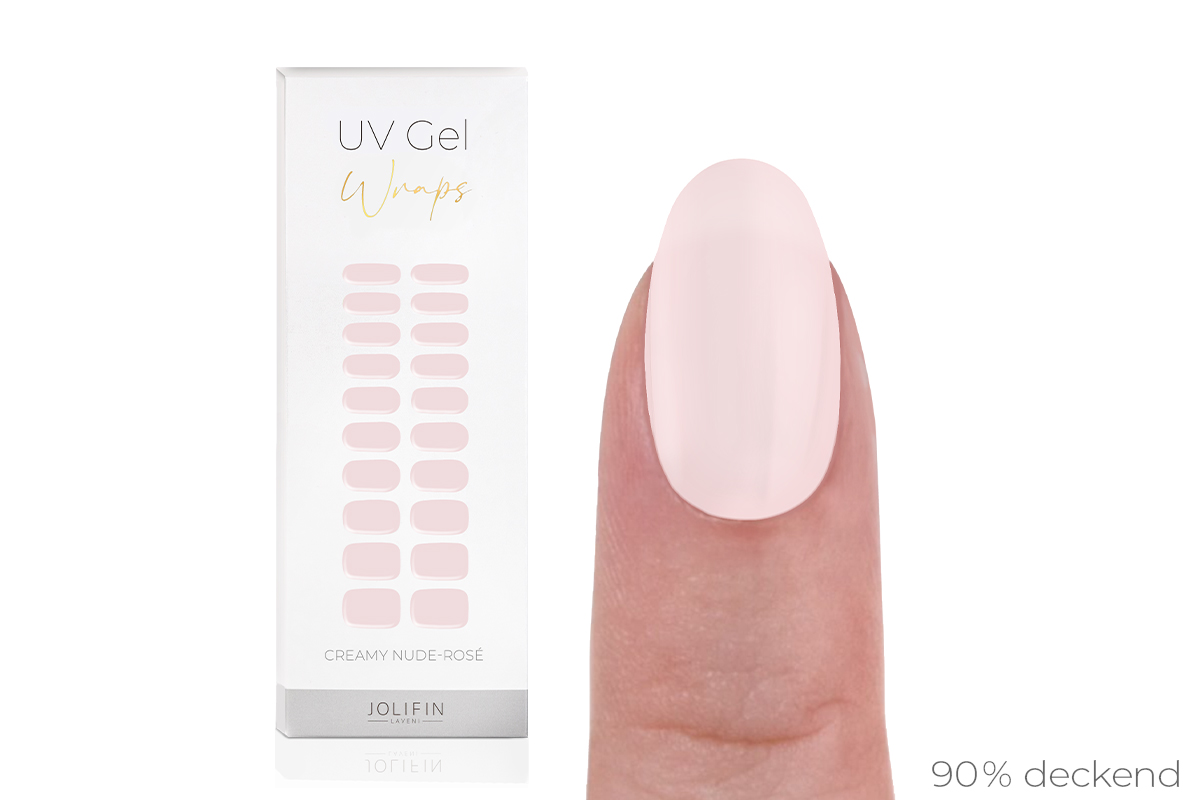Jolifin LAVENI UV Gel-Wraps - creamy nude-rosé sorgen für perfekt manikürte Nägel, mit nur 3 Steps erstellt, bis zu 14 Tagen Halt und dabei noch besonders schonend! Nägel vorbereiten, Wrap-Größe wählen, aufkleben und Überschuss kürzen, 60 Sekunden aushärten – fertig!