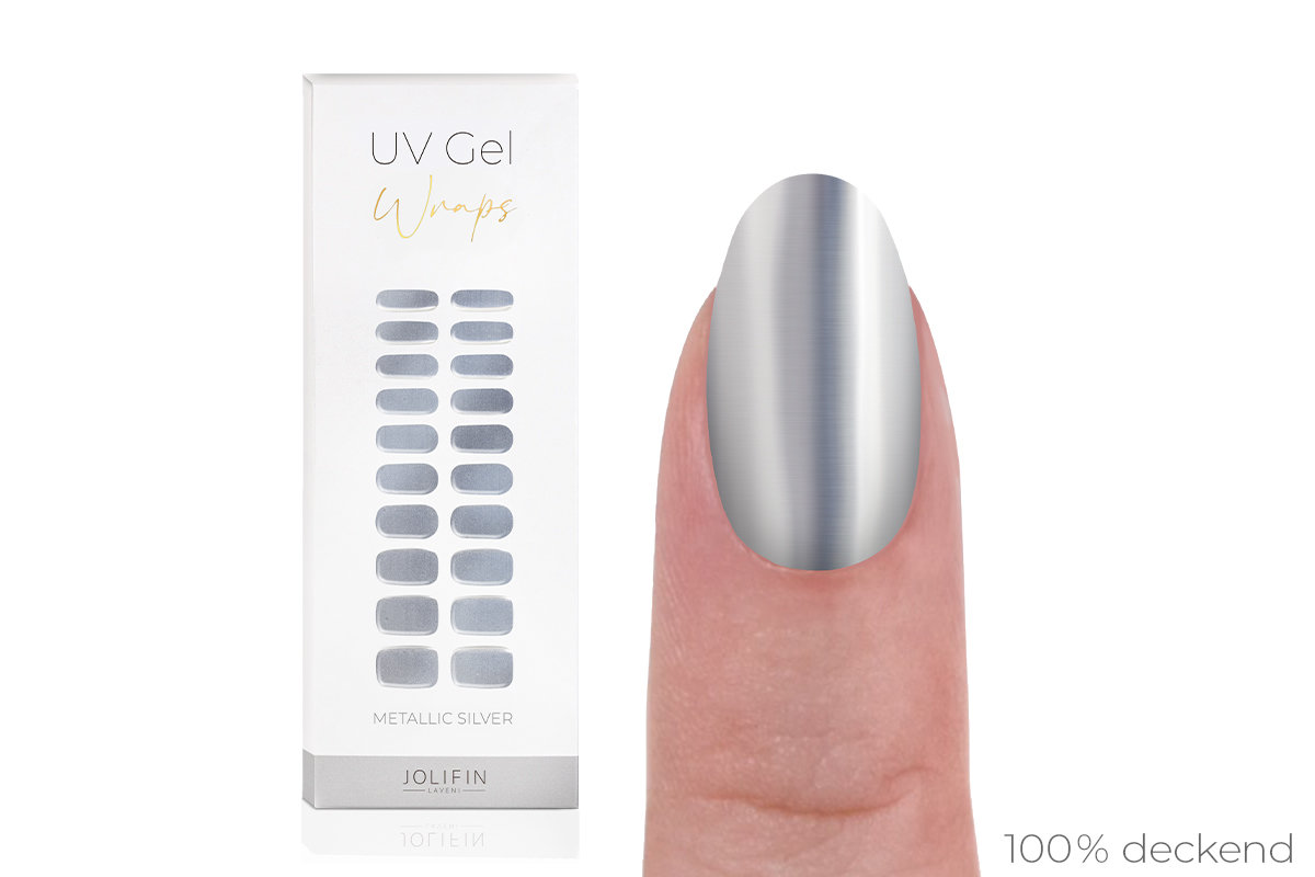 Jolifin LAVENI UV Gel-Wraps - metallic silver sorgen für perfekt manikürte Nägel, mit nur 3 Steps erstellt, bis zu 14 Tagen Halt und dabei noch besonders schonend! Nägel vorbereiten, Wrap-Größe wählen, aufkleben und Überschuss kürzen, 60 Sekunden aushärten – fertig!