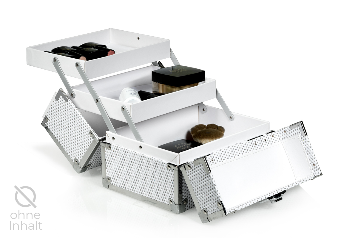 Jolifin Mobiler Kosmetik Koffer mini - white Glitter ist die perfekte Aufbewahrungsmöglichkeit für jede Frau. Der edle Koffer funkelt mit zahllosen kleinen Glitzersteinchen auf dem weißen Untergrund. Die Beschläge und das Schloss sind hochglänzend silberfarben. Das noble Jolifin-Emblem auf der Vorderseite trägt zusätzlich zur Wertigkeit bei. Gerade für Nageldesignerinnen, die mobil unterwegs sind, ist der Koffer ein unverzichtbares Hilfsmittel. Er verfügt über einen Stauraum mit zwei ausziehbaren Fächern. Im Lieferumfang sind zwei Schlüssel für die sichere Aufbewahrung Ihre wertvollen Utensilien enthalten.