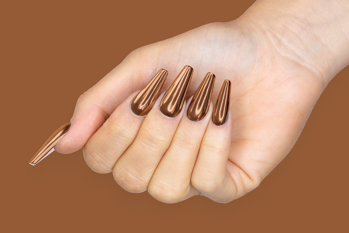 Jolifin Super Mirror-Chrome Pigment - copper sorgt für ein makellos spiegelglattes Design. Die extrafeinen Pigmente lassen Ihre Fingernägel wirken, wie in flüssiges Chrom getaucht. So entstehen im Handumdrehen perfekte Spiegeleffekte. Und das ist ganz einfach: überziehen Sie den fertigen Aufbau mit einem Farbgel Ihrer Wahl (am besten kommt der Effekt auf weißem Untergrund zur Geltung) und tragen Sie nach dem Aushärten eine dünne Schicht unseres Jolifin LAVENI Glossy Versiegelungs-Gel ohne Schwitzschicht 11ml auf. Nach ca. 40 Sekunden Aushärtungszeit im Dual-Lichthärtungsgerät wird das Pigment sofort auf den Nagel gestreut und gut eingearbeitet. Dazu eignet sich ein Jolifin Pigment-Applikator sehr gut. Überschüssige Pigmente lassen sich ausgezeichnet mit einem Jolifin Staubpinsel schwarz entfernen. Anschließend bitte zwei Mal versiegeln. Hier empfehlen wir das Jolifin LAVENI Versiegelungs-Gel mit UV-Schutz.