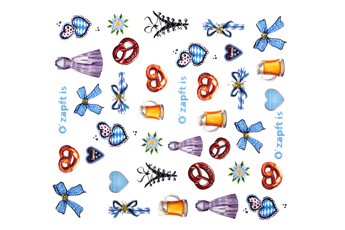 Motiv: Herbst, Oktoberfest, Brezeln, Dirndl, Schleifen, Herzen, Blumen, Bier, Bierkrug, Schriftzug, Corsagen, Punkte, Blau, Weiß, Gold, Gelb, Grün, Rosa, Lila, Schwarz, Braun, Rot